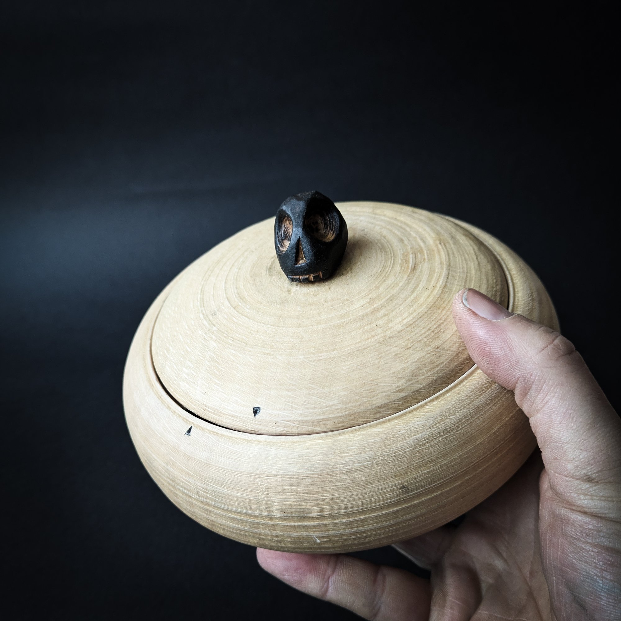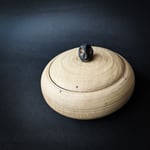 Locking lidded box turned on pole lathe with a hand carved handle. These boxes are based on beautiful old Swedish boxes. They are quite technical bits of turning, requiring a lot of precision. There are only a handful of turners in the world who have the skill to turn these mechanisms.