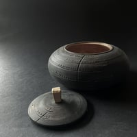 Locking lidded box turned on pole lathe with a hand carved handle. These boxes are based on beautiful old Swedish boxes with decoration inspired by Neolithic stone carving.