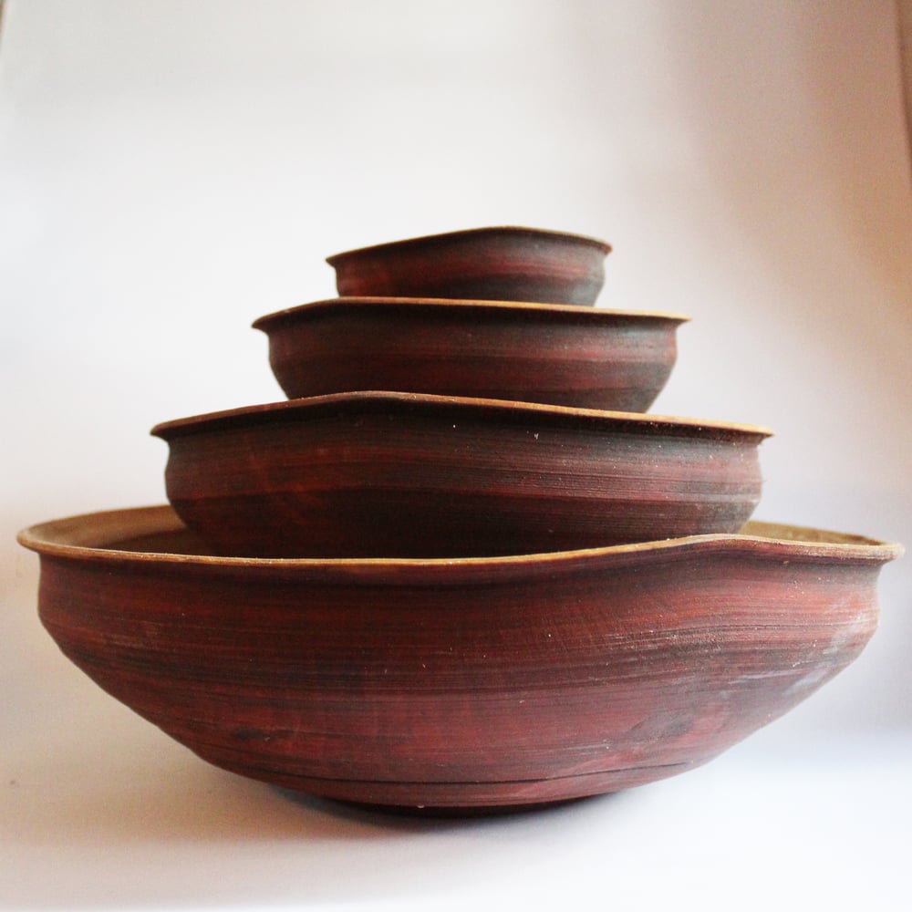 A nested set of four bowls made from a single piece of birch wood. If the bowls are aligned correctly, you can see the grain patterns running through all four.