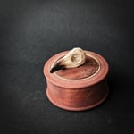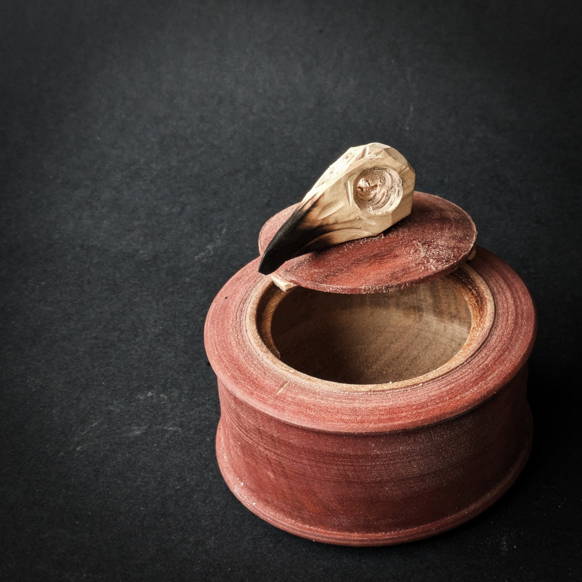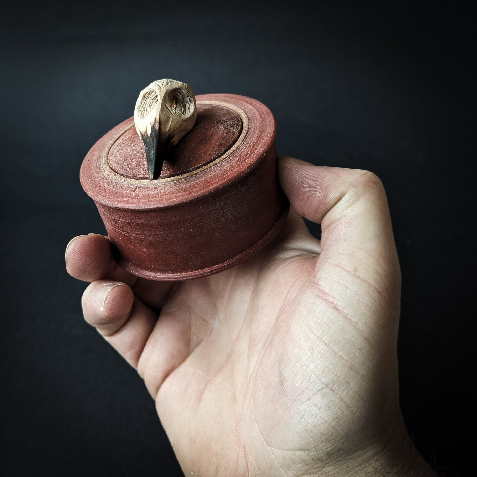 Locking lidded box turned on pole lathe with a hand carved handle. These boxes are based on beautiful old Swedish boxes. They are quite technical bits of turning, requiring a lot of precision. There are only a handful of turners in the world who have the skill to turn these mechanisms.